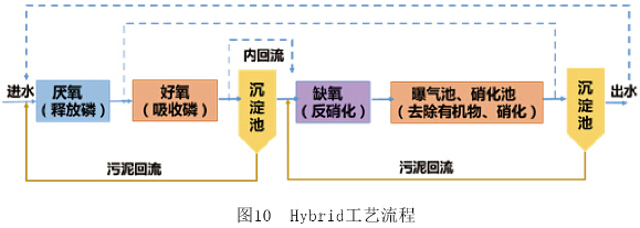 在AO-A2O工艺基础上奥地利研发出了Hybrid工艺(如图10),该工艺的两段之间有三个内回流装置,可以为第一段曝气池提供硝态氮、硝化菌以及为第二段曝气池提供碳源。第一段主要是去除有机物和磷,第二段是硝化功能,并靠第一段曝气池回流混合液进行反硝化脱氮